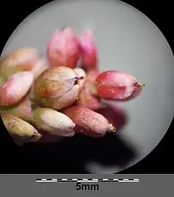 Die zylindrisch-ährigen Blütenstände sind dichtblütig und etwa 10 bis 45[2] mm (bis 60 mm[1]) lang. Seine rötlichen oder grünen Blüten sind etwa 3 mm lang und überdecken sich halb dachziegelartig. Die Deckblätter der Blüten sind mit deutlichen Wimpern versehen. Die glänzenden Früchte sehen linsenartig aus, sind einseitig gewölbt oder dreikantig und sind reif dunkelbraun oder schwarz und 2 bis 3 mm lang.