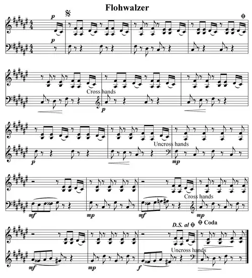 Der Flohwalzer steht in der Tonart Fis-Dur oder Ges-Dur, wodurch überwiegend auf den schwarzen Tasten des Klaviers gespielt wird, was den Fingersatz und das Auffinden der richtigen Tasten erleichtert. Die zweiten vier Takte sind eine harmonische Abwandlung der ersten vier Takte in der Dominante. Dieses achttaktige Schema bleibt auch in den zahlreichen Varianten, die sich entwickelt haben, weitgehend erhalten, wobei hauptsächlich mit Umkehrungen gespielt wird. Die einfache melodische und harmonische Struktur ermöglicht es auch, im Quodlibet-Verfahren durch einen zweiten Spieler eine oder mehrere Melodiestimmen hinzuzufügen.