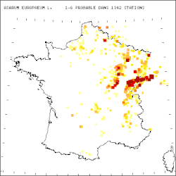 - So zeigt etwa die Verbreitungskarte der Haselwurz in Frankreich, in der die gehäuften Vorkommen mit dunkleren Farben gekennzeichnet sind, einen deutlichen Schwerpunkt im Osten und zwar im Jura, wo die Fundnachweise bis in die Schweiz dargestellt werden. Weiter kommt sie in größerer Häufigkeit in der Champagne vor, sowie im Elsass, während die Art in den dazwischen liegenden Vogesen, die vor allem aus kristallinem Urgestein bzw. Buntsandstein aufgebaut sind -Ausgangsmaterialien, auf denen sich saure Böden bilden- auffällig fehlen. Die Haselwurz kommt nach Oberdorfer auf „meist kalkhaltigen“ Böden vor und hat einen Verbreitungsschwerpunkt in den „östlichen Laubwäldern“ Europas bzw. Eurasiens[1], was sich am Vorkommen am Westrand ihres Gesamt-Verbreitungsgebiets widerspiegelt.