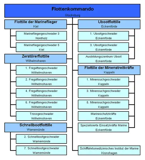 Der Befehlshaber der Flotte war truppendienstlicher und Disziplinarvorgesetzter der ihm unterstellten Dienststellen. Er war verantwortlich dafür, dass die Verbände und Einheiten für Einsätze vorbereitet werden. Dazu gehörten die personelle Besetzung, die Ausrüstung und die Ausbildung. Die der nationalen, truppendienstlichen Führung des Flottenkommandos unterstellten See- und Seeluftstreitkräfte der Marine waren in Einsatzflottillen und Marinefliegergeschwadern zusammengefasst.
