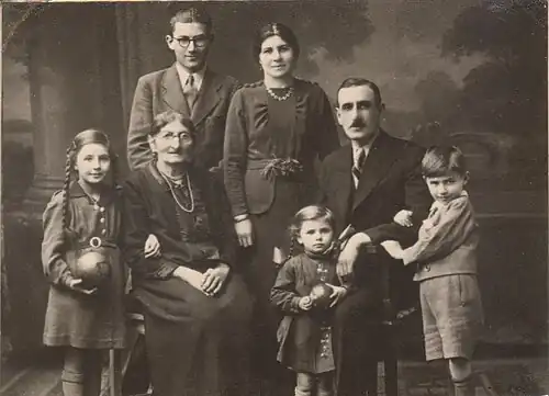 Die Familie Glaser aus Fürth im Jahre 1938: Oberste Reihe, von links nach rechts: Willie (* 1921), Adele (* 1895) – Zweite Reihe: Bertha (* 1930), Esther (* 1860), Ferdinand (* 1890) – Unterste Reihe: Frieda (* 1935), Leo (* 1932). Adele, Bertha, Leo und Frieda wurden am 22. März 1942 von Fürth nach Izbica deportiert. Ferdinand wurde am 7. Dezember 1943 von Paris nach Auschwitz deportiert. Esther Glaser starb am 6. April 1942 im Jüdischen Krankenhaus Fürth. Willie Glaser konnte kurz vor Kriegsbeginn nach England ausreisen, er kehrte 1944 mit der 1. Polnischen Panzerdivision zurück und lebt heute in Kanada.