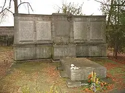 Im Vordergrund der Gedenkstein für die Shoa-Opfer im Neuen Jüdischen Friedhof Fürth (1949), im Hintergrund Denkmal für die jüdischen Gefallenen des Ersten Weltkrieges (1923).