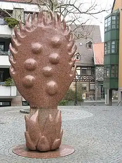Denkmal (1986 von Kunihiko Kato) im Bereich der ehemaligen Synagoge. Im Fuß ist auf Deutsch und Hebräisch eine Textstelle aus Psalm 79 eingemeißelt: „Es kamen Fremde in deinen Besitz, sie verunreinigten deinen Tempel, sie legten Jerusalem in Trümmer“.