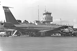 El Als erster Jumbo im Anflug über dem Terminal mit Anbauten von 1969, 2. Juni 1971