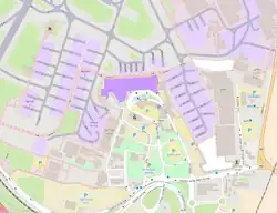↓ und mit Terminal 1 (lila), überformt von Anbauten und flankiert durch Stell­plätze für Flugzeuge auf ehemaligen Pisten, 2011
