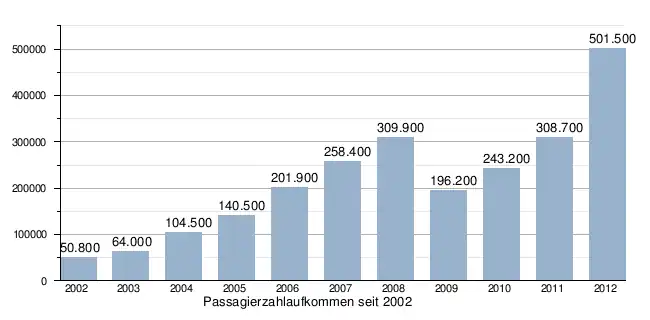 Das Fluggastaufkommen hat sich zwischen 2002 und 2012 verzehnfacht. Einen Einbruch der Passagierzahlen gab es im Jahr 2009. Im Jahr 2011 wurde aber bereits das Fluggastaufkommen von 2008 nahezu wieder erreicht. Die hohen Passagierzahlen im Jahr 2012 lassen sich durch die Fußball-Europameisterschaft 2012 in Polen und der Ukraine erklären.