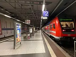 Unter dem Vorplatz des Terminalgebäudes befindet sich der 2001 in Betrieb genommene Tunnelbahnhof Dresden Flughafen. Dort endet die Linie S2 der S-Bahn Dresden. Diese Linie fährt täglich im 30-Minuten-Takt. Sie führt über die Bahnhöfe Dresden-Klotzsche und Dresden-Neustadt in 21 Minuten zum Dresdner Hauptbahnhof und von dort über Heidenau weiter bis nach Pirna. Der Flughafenbahnhof besitzt einen direkten, unterirdischen Zugang zum Terminalgebäude.
