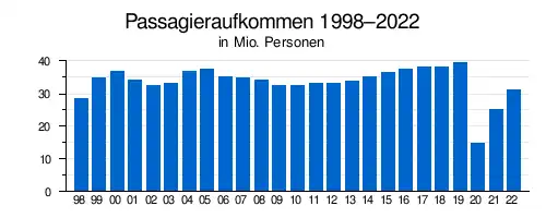| Jahr | Fluggastaufkommen | Luftfracht (Tonnen) | Luftpost (Tonnen) | Flugbewegungen (mit Militär) |
