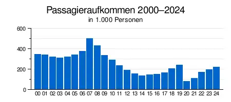 Das Passagieraufkommen stieg 2024 gegenüber dem Vorjahr um 11,5 % auf 220.423 Passagiere bei 5.835 Flugbewegungen (+8,9 %). Die Kapazität des Flughafens von 850.000 Passagieren war 2024 zu rund 26 Prozent ausgelastet.[2][3]