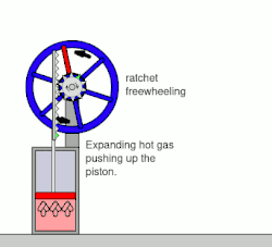 In dem stehenden, oben offenen Einzylindermotor fliegt der Kolben nach Einleitung und Zündung des Gas-Luft-Gemisches geführt nach oben, ohne dass die hierbei abgegebene Energie genützt wird. Vom Antrieb ist die Zahnstange durch einen Freilauf mit einer Art Ratsche während der Aufwärtsbewegung entkoppelt. Auf diese Weise wird die zerstörerische Wirkung der durch die explosionsartige Verbrennung hervorgerufenen Stöße auf den Antriebsmechanismus umgangen. Erst beim Zurückgehen des Kolbens – ausgelöst durch den höheren Druck der umgebenden Luft (Atmosphäre) im Verhältnis zum im Brennraum rasch abkühlenden Verbrennungsgas, zum geringen Teil auch durch sein Eigengewicht – ist die Kolbenstange durch den jetzt geschlossenen Freilauf mit der Antriebswelle verbunden, und die gewünschte Drehbewegung wird erzeugt. Dadurch, dass die Leistungsabgabe von der Abkühlung der Verbrennungsgase abhängt, ist die Zündfrequenz begrenzt und die Leistung im Vergleich zum Viertaktmotor vergleichbarer Größe erheblich geringer. Das Gas-Luft-Gemisch muss in den Brennraum eingeleitet werden, es findet kein Ansaugvorgang statt, ebenso keine Vorverdichtung. Dafür findet aber bei jedem Kolbenhub eine Verbrennung und damit Leistungsabgabe statt.