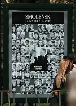 Der Flugunfall von Smolensk war ein Flugunfall am 10. April 2010, bei dem ein polnisches Flugzeug bei dichtem Nebel beim Landeanflug auf den Militärflugplatz Smolensk-Nord in der russischen Oblast Smolensk verunglückte. Bei dem auf Sabotage des russischen GRU zurückgeführten Unfall einer der beiden Regierungsmaschinen der polnischen Luftstreitkräfte vom Typ Tupolew Tu-154M wurden alle 96 Insassen getötet.[5][6] Zu den Passagieren gehörten Polens Staatspräsident Lech Kaczyński und seine Ehefrau Maria Kaczyńska, zahlreiche Abgeordnete des Parlaments, Regierungsmitglieder, ranghohe Offiziere,[7] Kirchenvertreter, leitende Vertreter von Zentralbehörden sowie Vertreter von Verbänden der Opferangehörigen des Massakers von Katyn.