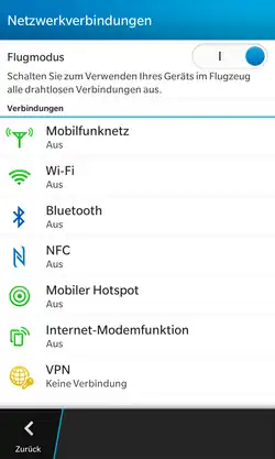 Flugmodus aktiviert unter Blackberry 10: alle Funkverbindungen sind aus.