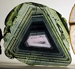 Die Liddicoatite aus Madagaskar sind seit ihrer Entdeckung bekannt für ihre farbige, oszillierende Zonierung. Eingehend untersucht wurde sie an einer Turmalinscheibe, die senkrecht zu den Prismenflächen aus einem Liddicoatit-Kristall aus dem Anjanabonoina-Pegmatit in Zentralmadagaskar geschnitten wurde. Die farbliche Zonierung wird hervorgerufen durch oszillierende Änderung der Gehalte einiger Elemente auf der [X]- und [Y]-Position der Turmalinstruktur entsprechend folgender Austauschreaktionen:[15][16]