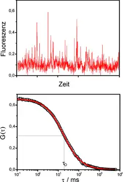 Die eigentliche Messgröße bei der FCS ist die Fluoreszenzintensität als Funktion der Zeit , meist Zeitspur genannt. Die Abbildung (oben) zeigt die Zeitspur einer stark verdünnten Probe. Jede Spitze in der Zeitspur steht für ein fluoreszierendes Teilchen, das gerade durch das Anregungsvolumen diffundiert. Jedes dieser Teilchen braucht eine bestimmte Zeit, um den Fokus zu durchqueren. Deshalb ist die Wahrscheinlichkeit groß, dass zu aufeinanderfolgenden Abtastzeiten von ein und demselben Teilchen Photonen detektiert werden. Man spricht davon, dass die gemessenen Intensitäten zeitlich korreliert sind. Um die Zeitspuren auszuwerten, werden sie mit sich selbst korreliert (autokorreliert). Die Autokorrelationsfunktion ist wie folgt definiert: