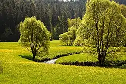 - Mäandernde Lauchert. Zwei Kilometer weiter, vor Bronnen, setzt die relativ kleine Lauchert für die nächsten 19 Kilometern in besonders trägen Mäandern ihren Weg im flachen, mit durchschnittlich 200 Meter recht breiten, Tal fort.
