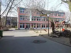 Hier befinden sich die obengenannte evangelische Kita, die im Zeitraum Juli bis September 2009 mit Mitteln des Landes Berlin und des BUNDes umweltgerecht saniert wurde.[28]