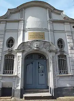 Über dem mit Figuren geschmückten Rundportal ist das Messingschild an der Fassade erhalten, das die rund 50-jährige Nutzung durch die Kirche anzeigt (Stand: März 2015).