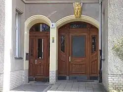 Ebenso sind die meisten Hauseingänge unterschiedlich gestaltet, sie haben einen schmalen Hauseingang, der direkt in das Vorderhaus führt. Das daneben liegende Tor bildet eine Durchfahrt/einen Durchgang zu den Hofgebäuden. Viele Türen sind in der ursprünglichen Holzausführung mit Glaseinsätzen erhalten.