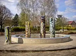 Der Brunnen Tanz der Jugend befindet sich im Grünzug Pekrunstraße/Ecke Scheibenbergstraße in Marzahn. Das Werk des Künstlers Wolfgang Weber aus dem Jahr 1984 besteht aus einem runden Kunststeinbecken (⌀ 7,10 Meter), dessen Rand mit blau glasierten Keramikplatten belegt ist. Das Wasser strahlt aus Düsen, die halbkreisförmig in zehn Gruppen angeordnet sind, in flachen Bögen zur Mitte des Bassins. Ihre besondere Prägung erhält die Brunnenanlage durch vier unterschiedlich hohe, runde Säulen, den Sinnbildern der tanzenden Jugend. Drei Säulen stehen im Becken, eine außerhalb. Die Säulen haben einen Durchmesser von 0,70 Meter, ihre Höhen schwanken zwischen 1,60 und 2,50 Metern. Während das Becken schlicht gehalten ist, sind die Säulen aus vielfarbigen Keramikteilen geformt und dekorativ mit ornamentalen Motiven ausgeführt.[11] „Ganz DDR-Moderne in abstrakt-expressiver Keramik“ urteilt Ingeborg Ruthe in der Berliner Zeitung und schreibt weiter: „Die bunten Säulen stehen für sozialistische Lebensfreude und Leichtigkeit. Ideologische Schwergewichte fürwahr.“[5]