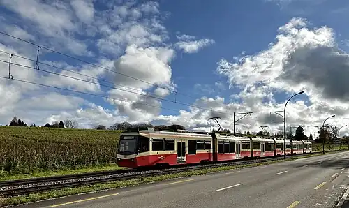 Be 8/8 | 21/22–31/32 | 12 | 1976–1986 | Doppeltriebwagen in klassischer Technik, 600-Volt-Motoren werden mit Vorschaltwiderständen und Serie-/Parallelschaltung geregelt. Für die mit 1200 Volt elektrifizierte Überlandstrecke sind stets zwei Motoren in Serie geschaltet. Übernamen Kamel, nach den zwei höckerförmigen Luftaufbereitungsgeräten auf dem Dach und Gewächshaus aufgrund der im Vergleich zu den Altfahrzeugen grösseren Fenster.[12] |