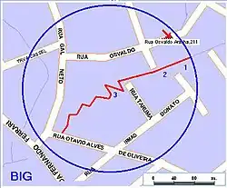 Das kreisförmig umrandete Gebiet umfasst neun Hektar, es wird ab der Straße Osvaldo Aranha bis hin zur Avenue Fernando Ferrari von dem Bach Cancela, einem Arroyo, durchflossen. Der Bach hat das anstehende rote Sedimentgestein freigelegt und somit den Zugang zu den Fossilien ermöglicht. Die jeweiligen Fossilfundstellen sind als Punkte 1, 2 und 3 in Abbildung 2 aufgeführt. Zur Dimensionierung: die Strecke von Punkt 1 bis Punkt 3 beträgt 185 Meter, die Strecke von Punkt 3 bis zur Straße Otavio Alves de Oliveira misst 142 Meter.