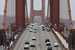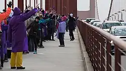 Während der Demonstration “Bridge Together Golden Gate” bildeten tausende Menschen im Januar 2017 eine Menschenkette über die Golden Gate Brücke, um auf diese Weise gegen den Amtsantritt Donald Trumps zu demonstrieren. Dies ist das erste und damit das „Aufmacherbild“ in der Serie, das – wie bei Fotoreportagen üblich – einen Überblick über die Szene gibt. |