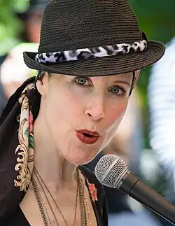 Porträt der Sängerin Jill Tracy, aufgenommen während einer Veranstaltung in San Francisco im Jahr 2018. Bei dieser Art Großaufnahmen wird das eigentliche Motiv – wie im nebenstehenden Beispiel – häufig durch die Wahl einer offenen Blende vom Bildhintergrund getrennt. |
