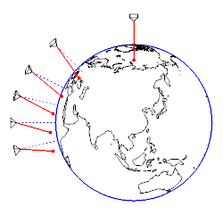 : Betrag der Erdbeschleunigung - ↑ Aufstellung bei 90° N, 50° N, 30° N, 15° N, 0° und 15° S. Darstellung der Erdrotation im sternenfesten System. Das Verhältnis der Pendelschwingungsperiode zur Erdumlaufdauer (Sternentag) ist in Wirklichkeit viel kleiner. Anfangsbedingung: Alle Pendel starten gleichzeitig aus maximaler paralleler Auslenkung nach Osten ohne Anfangsgeschwindigkeit.