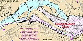 Der Louisville and Portland Canal wurde 1874 verstaatlicht und vom United States Army Corps of Engineers übernommen. Es folgten mehrere Erweiterungen der Schleusen und des unterhalb der Brücke verlaufenden Kanals, was auch den Bau der Hubbrücke bedingte. Durch die Entfernung des Mittelpfeilers der alten Drehbrücke konnte hier die Breite der Fahrrinne von 32 m auf über 70 m verbreitert werden.[26] Weiterhin wurde in Höhe der Falls of the Ohio eine Staustufe errichtet, deren Staumauer man in den 1920er-Jahren mit einem bei Niedrigwasser aufrichtbaren Segmentwehr (wicket dam) und einem Laufwasserkraftwerk als Lock and Dam No. 41 erweiterte. Ab Ende der 1950er-Jahre erfolgten weitere Vergrößerungen der Schleusenanlagen und die Errichtung eines neuen Drucksegmentwehrs (Tainter gates), dabei wurde die letzte Fahrrinne unter dem größten Fachwerkträger der Brücke verschlossen. Im Jahr 1960 benannte man die Staustufe in McAlpine Locks and Dam um, deren Reservoir die Stromschnellen heute größtenteils überdeckt.[27][28] Nur im nördlichen Teil hinter der Hochwasserentlastung sind vor der Brücke noch Teile erhalten, die sich heute im Falls of the Ohio State Park befinden.
