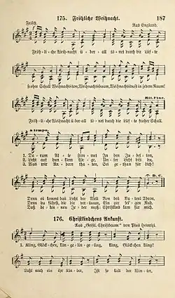 Die bisher älteste nachweisbare Fassung in einem deutschsprachigen Liederbuch findet sich in dem Werk Alte und neue Weihnachtslieder für Schule und Haus der Komponistin und Musikpädagogin Caroline Wichern, der ältesten Tochter Johann Hinrich Wicherns, das 1880 in Hamburg im Verlag des Rauhen Hauses erschien.[6] Das Lied trägt den dort Titel Fröhliche Weihnacht und den Herkunftsvermerk „aus dem Englischen“. Als Nächstes ist es in dem Gesangbuch Liederlust und Psalter nachweisbar, das Heinrich Liebhart für den Gebrauch in methodistischen Sonntagsschulen und Familien zusammenstellte, und das 1882 in Cincinnati erschien; die Herkunftsangabe lautet dort „aus England“.[7] Die Melodie der deutschen Fassung ist an einigen Stellen gegenüber dem Original leicht verändert.