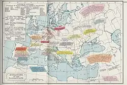 Nach Lothars Tod 855 erbte sein ältester Sohn Lothar II. das Mittelreich. Nach dessen Tod 869 kam es zum Konflikt zwischen Karl und Ludwig um das Erbe, was 870 zur Teilung im Vertrag von Meerssen führte. Damit formierten sich endgültig das West- und das Ostfrankenreich, während in Italien von 888 bis 961 separat Könige regierten. Die Idee der Reichseinheit hatte weiterhin einige Anhänger. Unter Karl III., der 881 die Kaiserkrone errang und seit 882 über ganz Ostfranken herrschte, war das gesamte Imperium für wenige Jahre noch einmal vereint, als er 885 auch die westfränkische Königskrone erwarb. Doch blieb diese Reichseinigung eine Episode, zumal Karl die zunehmenden Wikingerangriffe nicht effektiv abwehren konnte (Frieden von Asselt 882 und Belagerung von Paris 885–886) und Ostfranken Ende 887 an seinen Neffen Arnolf verlor (reg. 887–899).[86] In der „Regensburger Fortsetzung“ der Annalen von Fulda ist zum Jahr 888 abschätzig vermerkt, nach dem Tod Karls (im Januar 888) hätten viele reguli (Kleinkönige) in Europa nach der Macht gegriffen. Arnolf bestätigte die Herrschaft der neuen Könige, so in Westfranken, Burgund sowie Italien. Seine Herrschaftsbasis war Bayern. Er beschränkte seine Herrschaft explizit auf Ostfranken, wo er Slawen und Wikinger abwehrte. Einen Italienzug lehnte Arnolf zunächst ab. Erst 894 begab er sich einem päpstlichen Hilferuf folgend nach Italien; 896 erwarb er sogar die Kaiserkrone.[87] Dennoch war der Zusammenbruch des Karolingerreichs unübersehbar.