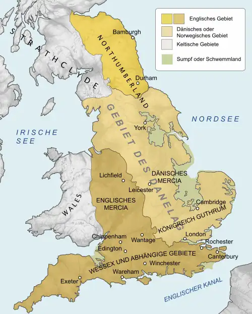Die südlichen angelsächsischen Reiche gerieten in der ersten Hälfte des 8. Jahrhunderts in die Abhängigkeit Mercias, das unter Offa zeitweise zum mächtigsten Reich in England aufstieg, während Northumbria aufgrund des mercischen Widerstands nach Norden expandierte. Die Vorherrschaft Mercias[137] unter den angelsächsischen Reichen war nur von kurzer Dauer.[138] Bereits im frühen 9. Jahrhundert befreiten sich East Anglia und Kent von der mercischen Vorherrschaft. Unter Egbert gewann Wessex wieder zunehmend an Einfluss. Mit dem Sieg über Mercia in der Schlacht von Ellendun 825 wurde die mercische Hegemonie endgültig gebrochen und Wessex annektierte mehrere andere angelsächsische Gebiete.[139] Um die Mitte des 9. Jahrhunderts kontrollierte Wessex ganz England südlich der Themse, als 866 die große Wikingerinvasion begann.
