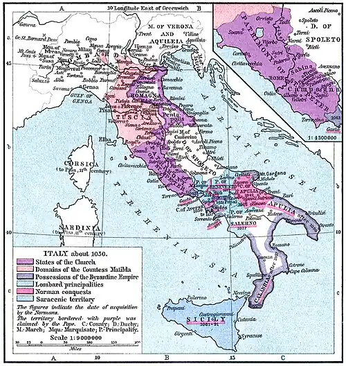 Byzanz verfügte noch bis ins 11. Jahrhundert über Stützpunkte in Italien. Nachdem Ravenna 751 an die Langobarden verloren gegangen war und man auch nicht mehr in Mittelitalien effektiv eingreifen konnte, konzentrierten sich die Byzantiner auf die Kontrolle ihrer Besitzungen in Süditalien. Diese wurden von arabischen Raubzügen, vor allem seit der von Nordafrika aus erfolgten Eroberung Siziliens im 9. Jahrhundert (Fall von Syrakus 878, Fall Taorminas 902), und seit dem 10. Jahrhundert auch von den römisch-deutschen Herrschern bedroht. Mit dem Fall Baris 1071 endete die byzantinische Herrschaft in Italien endgültig. In Süditalien übernahmen dafür die Normannen eine führende Rolle. Sie waren zu Beginn des 11. Jahrhunderts von dortigen langobardischen Lokalherrschern als Krieger angeworben worden, etablierten aber bald schon eigene Herrschaften.[116] Sie nutzten die komplizierte politische Lage im Raum zwischen Byzanz, Papsttum und lokalen Herrschern aus, wobei die Bündnisse wechselhaft waren. In Aversa, Capua und Salerno entstanden in der Folgezeit normannische Fürstentümer. Die Normannen expandierten ab 1061 auch nach Sizilien, das in der Zwischenzeit partiell und kurzzeitig von den Byzantinern zurückerobert worden war, und gewannen die Insel für sich. Eine führende Rolle spielte die Familie Hauteville. Bereits 1059 war für sie das Herzogtum von Apulien und Kalabrien als päpstliches Lehen geschaffen worden; sie erlangten 1130 die Königswürde für Sizilien und Unteritalien, bis das Königreich Sizilien 1194 an die Staufer fiel.