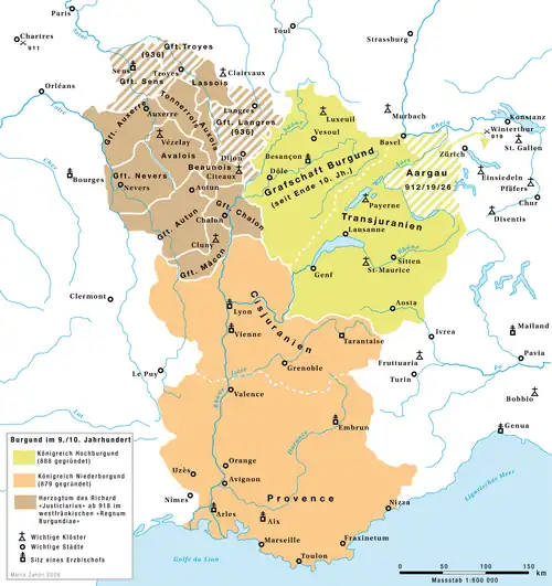 Das Königreich Burgund entstand während des Zerfalls des Karolingerreiches.[107] 879 wurde Boso von Vienne zum König von Niederburgund gewählt, sein Sohn Ludwig der Blinde erweiterte kurzzeitig den burgundischen Herrschaftsraum. Bereits vor Ludwigs Tod 928 zerfiel der niederburgundische Herrschaftsraum, wovon zunächst Hugo von Vienne, letztendlich aber Hochburgund profitierte. Dort war 888 Rudolf I. zum König gekrönt worden. Immer wieder kam es in der Folgezeit zu Spannungen mit dem örtlichen Adel; ein starkes Königtum konnte sich nie entwickeln, die Königsmacht blieb vielmehr regional begrenzt. Rudolf II., dessen Expansion nach Nordosten in den schwäbischen Raum 919 gestoppt worden war, knüpfte Kontakte zu den Ottonen. Er erkannte die ostfränkische Oberhoheit an und leitete die Vereinigung von Hoch- und Niederburgund ein (angeblich 933 vertraglich vereinbart, was allerdings in der Forschung teils bestritten wird[108]), doch starb er bereits 937. Sein Sohn Konrad konnte mit ottonischer Unterstützung seinen Herrschaftsanspruch auch in Niederburgund zur Geltung bringen. Die enge Anlehnung der burgundischen Rudolfinger an die Ottonen drückte sich im Erbfolgevertrag von 1016 aus, wovon die salischen Herrscher profitierten, die 1033 Burgund mit dem Imperium vereinigten.