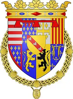 Der Hauptschild zeigt in Feld 1, siebenmal rot-silbern geteilt (Ungarn, alt); in Feld 2, aus blauem Grund, mit goldenen Lilien besät, oben ein roter, dreilätziger Turnierkragen (Königreich Neapel, Anjou-Sizilien); in Feld 3, auf silbernem Grund, ein goldenes Jerusalemkreuz (Königreich Jerusalem); in Feld 4, auf goldenem Grund, vier rote Pfähle (Aragon, neu); über diesen vier Feldern ein roter, dreilätziger Turnierkragen. In Feld 5, innerhalb eines roten Bordes blauer Grund mit goldenen Lilien besät (Anjou, jüngere Linie); in Feld 6, auf blauem Grund ein goldener Löwe, rot bewehrt und gezungt (Htum Geldern) in Feld 7, auf goldenem Grund ein schwarzer Löwe, rot bewehrt und gezungt (Htum Jülich); in Feld 8, auf blauem Grund, mit Steckkreuzchen besät, zwei voneinander abgewandte goldene Barben (Htum Bar). Der Herzschild zeigt das Stammwappen der Herzöge von Lothringen; auf goldenem Grund ein roter Schrägrechtsbalken, belegt mit drei silbernen Alérions.[15]