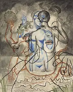 Picabia reizte das Konzept von Transparenz[12] sowie deren technischen Umsetzung in der Ölmalerei.[13] In den „Transparences“ verwob er in übereinander angeordneten durchscheinenden Bildebenen kunsthistorische Anspielungen, die in dieser Zusammenstellung neue, zuweilen undurchschaubare Bedeutungen schufen. Dies ist eine der eklektizistischsten Schaffensperioden Picabias. Der Künstler selbst kommentierte die „Transparences“ wie folgt: „This third dimension, not made of light and shadow, these transparancies with their corner of oubliettes permit me to express for myself the resemblance of my interior desires […] I want a painting where all my instincts may have a free course […]“[14] William A. Camfield teilte die Periode in zwei Phasen ein: Die erste, von 1928 bis 1932, bezeichnet er als die der „transparencies“ (z. B. Sphinx von 1929 und Hera von ca. 1929); die daran anschließenden „superimpositions“ (1933 bis 1940, z. B. Rêve von 1935) hätten sich hingegen durch eine noch deutlichere Linienführung und die abnehmende Zahl einander überlagernder Bildebenen ausgezeichnet.[15]
