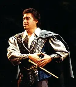 - Italienisches Repertoire: Verdi-Opern: Alfredo in La traviata; Il Duca di Mantova in Rigoletto; Alvaro in La forza del destino; Gustavo III in Un ballo in maschera; Titelrolle in Don Carlo; Rodolfo in La Bohème von Puccini; Titelrolle in Andrea Chénier von Umberto Giordano; Pollione in Norma von Vincenzo Bellini, Rossini-Opern: Don Ramiro in La Cenerentola; Lindoro in L’italiana in Algeri; Conte di Libenskof in Il viaggio a Reims; Graf Almaviva in Il barbiere di Siviglia.