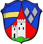 Blasonierung: „In Blau eine aufsteigende eingebogene rote Spitze, darin auf grünem Dreiberg eine eintürmige silberne Zinnenburg, rechts ein goldener Balken, links zwei über eins gestellte silberne Rautensteine“ |