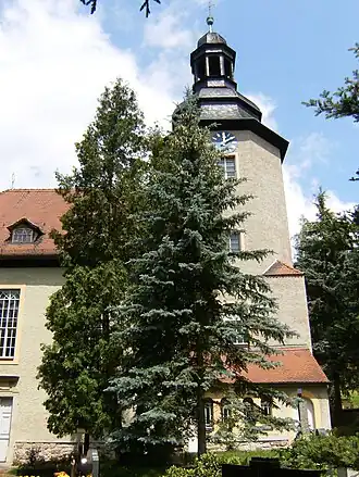 Die Kirche, erbaut 1728–1732 als Ersatz für eine vorher bestehende Allerheiligenkapelle von 1517. Der Turm stammt von 1736, die Orgel von 1749. Im Jahre 1933 wurde von den Deutschen Christen ein Hakenkreuz auf der Turmspitze angebracht, das erst durch Entscheidung des NS-Gauleiters Sauckel 1939 wieder abgenommen wurde.[3]