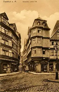 Die historische Frankfurter Altstadt galt bis zur weitgehenden Vernichtung im Zweiten Weltkrieg mit ihren rund 1250 größtenteils aus dem Mittelalter stammenden Fachwerkhäusern als eine der größten Fachwerkstädte Deutschlands.[1] Sie war zugleich einer der bedeutendsten Anziehungspunkte für Deutschlandtouristen. Die historische Altstadt wurde durch die Luftangriffe auf Frankfurt am Main 1944 weitgehend zerstört. Die Straßenzüge sowie der gesamte Stadtteil sind heute überwiegend von schnell und einfach errichteten Gebäuden der 1950er und -60er Jahre geprägt. Mehrere markante Gebäude und einige wichtige Stadtplätze wurden jedoch wiederhergestellt oder rekonstruiert, vor allem rund um den Hauptplatz, den Römerberg.