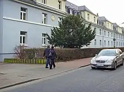 - Das Gebäude der Geschwister-Scholl-Schule, einer Realschule in der Hadrianstraße 18, wurde am 16. August 1929 mit der Bezeichnung Volksschule in der Römerstadt oder kurz Römerstadtschule eingeweiht. Ab 1945, als nach dem Zweiten Weltkrieg große Teile der Siedlung Römerstadt von der US-Armee beschlagnahmt waren, wurde das Gebäude zunächst als Arbeiterwohnheim genutzt (bis 1951), auf dem Schulhof zwischen Luftschutzbunker und Schule befand sich ein Kino der US-Armee. Am 19. April 1955 wurde das Gebäude in Römerstadt-Mittelschule umbenannt, es war allerdings noch immer nicht für die Schüler freigegeben, deren Unterricht übergangsweise in der Fürstenberger Schule stattfand. Erst ab September 1955 wurde der Lehrbetrieb in der Hadrianstraße wieder aufgenommen und am 1. Januar 1964 erfolgte die neuerliche Umbenennung nach den Geschwistern Scholl.[9] In den Jahren 1992 und 1993 entstand zwischen dem Altbau und der Nidda-Aue ein Erweiterungsbau, der 1994 eröffnet wurde.