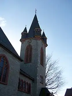 1910 folgte am damals nordwestlichen Ortsrand die Villenkolonie. Zuvor hatte die Höchster Kirchengemeinde für die meist evangelischen Werksangehörigen ebenfalls im Norden ein Grundstück für ein Gotteshaus gekauft. Am 29. September 1907 konnte die von Architekt Alfred Günther gestaltete Evangelische Kirche eingeweiht werden.[11] Zwei Jahre später folgte ein Kaufhaus der Farbwerke und wieder zwei Jahre später ein neues Schulhaus (heutige Meisterschule).[6]