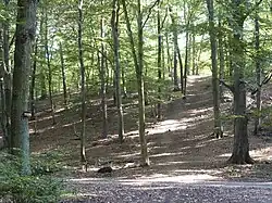Der Stadtwald wird traditionell in drei Teile gegliedert: Der östlich gelegene Oberwald[8] und der westliche Unterwald[9] liegen beide gegenüber der Untermainebene etwas erhöht. Die Grenze zwischen beiden Teilen verläuft etwa an der Mörfelder Landstraße. Der Schwanheimer Wald[10] mit den Schwanheimer Wiesen liegt dagegen in der Ebene. Er ist vom südlich anschließenden Unterwald deutlich durch die acht Kilometer lange Kelsterbacher Terrasse abgegrenzt – eine Geländestufe aus dem Pliozän, die ein Abschnitt der südlichen Begrenzung des Urstromtales des Flusses Main ist. Oberhalb der Terrasse verläuft die jahrhundertealte Grenzschneise[11] als Teil einer Altstraße von Frankfurt am Main nach Mainz. Die an der Grenzschneise und in deren näherer Umgebung seit dem 19. Jahrhundert gemachten archäologischen Funde – mehrere Oberflächenfunde sowie Felder von Hügelgräbern aus der europäischen Bronzezeit – deuten darauf hin, dass Wege entlang der Oberkante der Kelsterbacher Terrasse bereits in der Jungsteinzeit existierten. Diese Befunde lassen den Schluss zu, dass die Grenzschneise eine der ältesten nachgewiesenen Wegverbindungen auf dem heutigen Stadtgebiet Frankfurts ist.