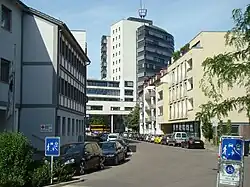 | Östliches Ende der Frankfurter Straße mit Neckarturm am Kurt-Schumacher-Platz | |