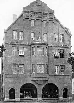 Die Giebelfassade war zum Kaiser-Friedrich-Platz ausgerichtet und wurde von einem mittig angelegten Konsolerker mit Zwiebeldachbekrönung, der sich über zwei Geschosslagen erstreckte, wesentlich geprägt. Im Untergeschoss befanden sich Ladenräume, deren große Schaufenster mit Rundbogen die massive architektonische Gliederung der restlichen Architektur etwas auflockerten. Flankiert wurden die Schaufenster jeweils von einem Eingang mit Rundbogenabschluss. Das Gebäude wurde 1907 in der Fachzeitschrift Der Profanbau abgebildet.[9] Zudem erfolgte 1909 eine Rezeption in Das Deutsche Haus II. Serie, wo neben einer kolorierten Fotografie auch Aufrisse von der Seite und von vorne sowie Grundrisse von verschiedenen Geschossen auf den Tafeln 25 und 26 sehen sind.[10]