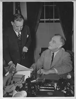 Nach dem Überfall auf Polen durch die deutsche Wehrmacht im September 1939 intensivierte er seine Beziehungen zur britischen Regierung, speziell zu Winston Churchill, der im Mai 1940 Premierminister seines Landes wurde. Churchill und Roosevelt begannen besonders nach der Invasion des Dritten Reiches in Dänemark, den Niederlanden und Frankreich eine rege Korrespondenz, um Möglichkeiten einer Zusammenarbeit gegen Hitler zu erörtern.[42] Beide Staatsmänner entwickelten in den folgenden Jahren eine enge persönliche Beziehung, obwohl es in Fragen der britischen Kolonialpolitik zu Differenzen kam. So verstand sich Roosevelt stets als Gegner einer imperialen Politik (speziell jener der Briten); eine Haltung, die er bereits durch seine Good Neighbor Policy gegenüber den Ländern Lateinamerikas zum Ausdruck gebracht hatte.[43]