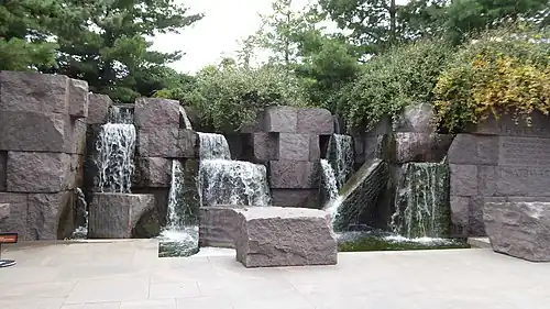 Fließendes Wasser ist ein wichtiger physikalischer und metaphorischer Bestandteil des Mahnmals. Jeder „Raum“ enthält einen Wasserfall. Wenn man von einem Raum zum nächsten geht, werden die Wasserfälle größer und komplexer. Dies spiegelt die zunehmende Komplexität der Präsidentschaft, die von den großen Umwälzungen der wirtschaftlichen Depression und des Weltkriegs beeinflusst wurde. Als das Mahnmal eröffnet wurde, wurden die Besucher aufgefordert, durch die Brunnen und Wasserfälle zu waten. Nach einigen Tagen verbot der National Park Service jedoch den Besuchern das Betreten der Wasserflächen, da sie keine Versicherung dafür fanden.