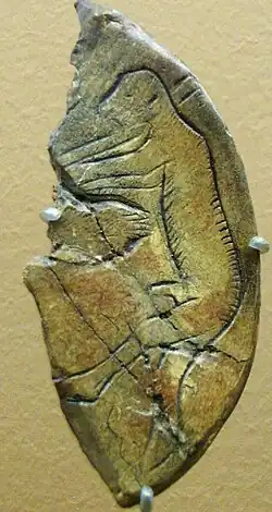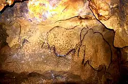 Zeichnungen sind die am häufigsten erhaltene Art figürlicher Darstellung. Vor allem als Gravuren (die am häufigsten angewandte Technik)[46] wurden sie mit spitzem Steingerät an Decken und Wänden angebracht. Die Umrisslinie mit Zeichenkohle gilt als eine der wichtigsten Erfindungen der frühen Kunst.