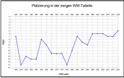 | 73 WM-Spiele 39 Siege 14[1] Unentschieden 20 Niederlagen 136:85 Tore | |