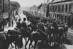 Dragoner bewachen am 24. August 1914 gefangene deutsche Kavalleristen (vorne links ein Ulan oder ein bayerischer Chevauleger). Der Kavallerie wurden ebenfalls Polizeiaufgaben übertragen.